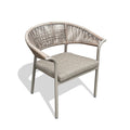 Silla para comedor con estructura de aluminio, ligera y resistente a la intemperie. Su diseño en cuerda tejida añade un toque moderno y elegante, mientras que los cojines incluidos brindan mayor comodidad para disfrutar al aire libre con estilo. Ideal para espacios exteriores sofisticados y funcionales