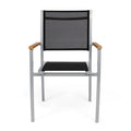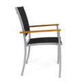 Con su estructura fabricada totalmente de aluminio, este modelo posee durabilidad y resistencia a los elementos. Sus asientos y respaldos están elaborados con textileno, un material conocido por su frescura y facilidad de mantenimiento. Los reposabrazos adornados con detalles en madera de teca ofrecen un toque de lujo y confort adicional.