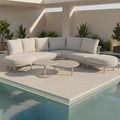 Los asientos incluyen cojines acolchados con espuma de alta densidad y telas impermeables de alta calidad, resistentes a los rayos UV y fáciles de limpiar, garantizando comodidad y larga duración incluso en condiciones exteriores exigentes.