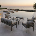 Los asientos incluyen cojines acolchados con espuma de alta densidad y telas impermeables de alta calidad, resistentes a los rayos UV y fáciles de limpiar, garantizando comodidad y larga duración incluso en condiciones exteriores exigentes.